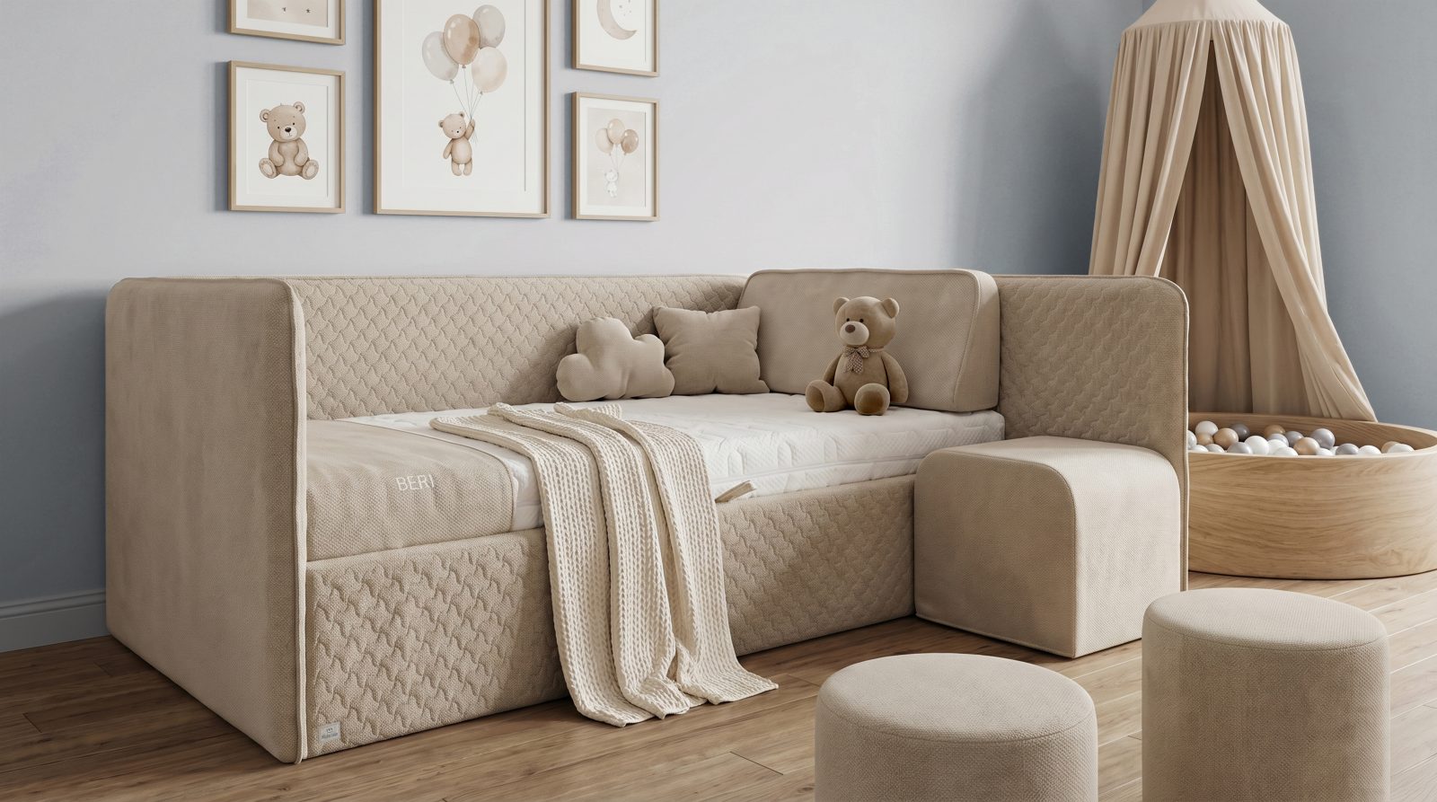 Základom je variabilná posteľ BERI s možnosťou kombinácie 1 až 3 čalúnených čiel a prednej zábrany, ktorá vytvára útulný a bezpečný priestor na spánok. Mäkké čalúnenie s penovou vrstvou tlmí kontakt a zvyšuje ochranu.