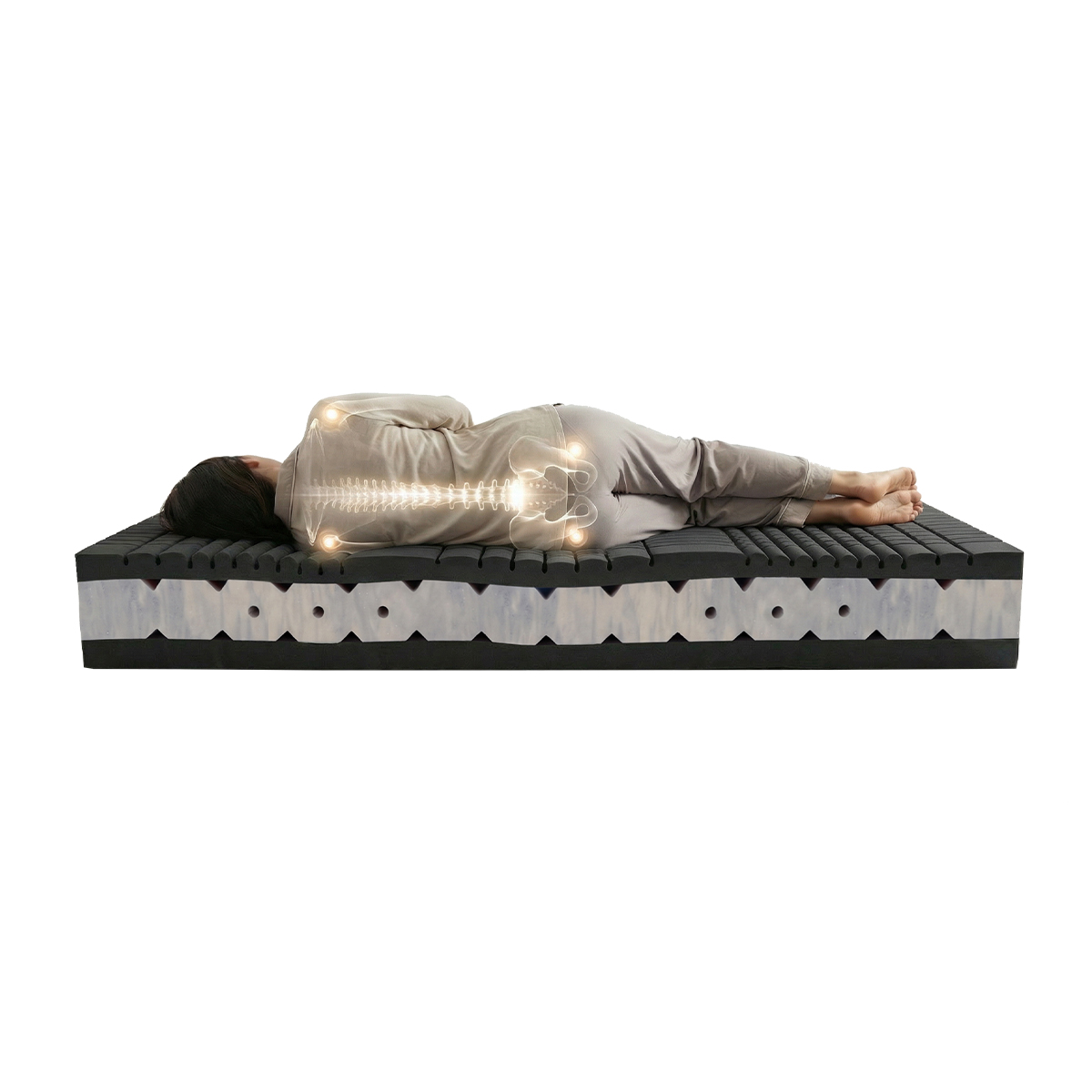 Výsledkom je pocit stability, ľahkosti a prirodzenej rovnováhy počas celej noci – bez ohľadu na zmeny spánkovej polohy či zaťaženia.