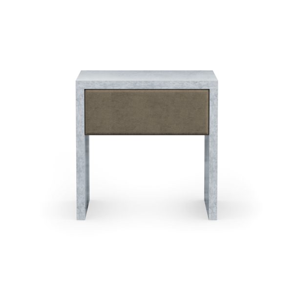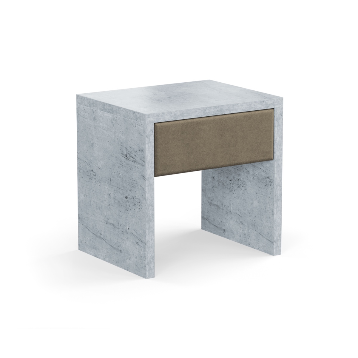 Praktický nočný stolík s čalúnenou zásuvkou a rámom v atraktívnom dizajne imitácie kameňa v dvoch odtieňoch (svetlý a tmavý).